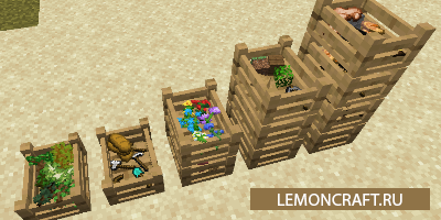 Мод на ящики Market Crates небольшой декоративный мод, который добавляет в игру ящики, типа магазинных, в которые перевозят овощи и фрукты. Вы сможете создать данные ящики из различных видов древесины, их можно ставить штабелями и даже под наклоном, установив под них палки. Для установки одного ящика на другой нужно зажать клавишу Shift.